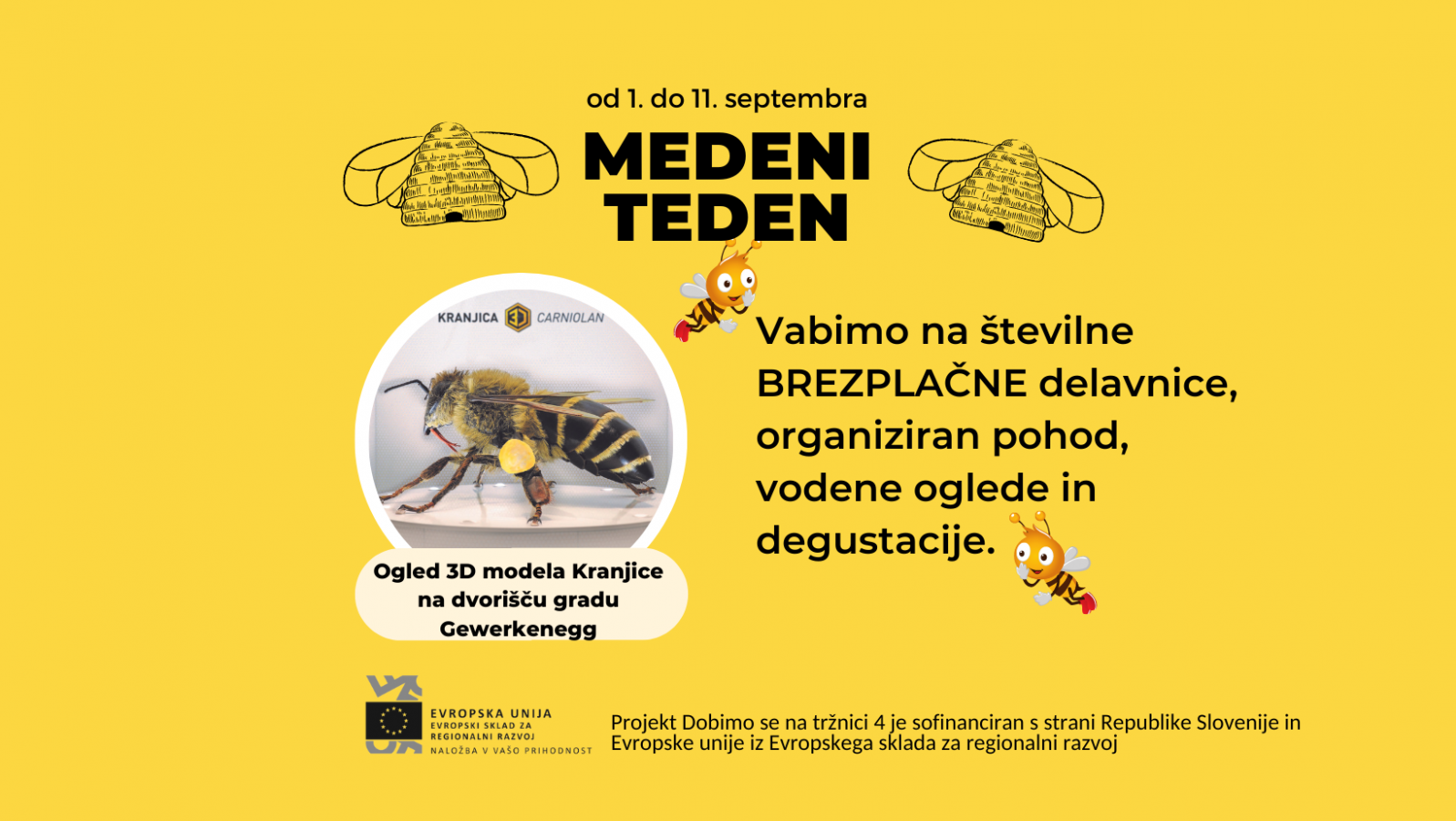 Vabimo vas, da se nam pridružite na številnih zanimivih aktivnostih, ki bodo potekale v okviru Medenega tedna od 1. do 11. septembra, ko bo v Idrijo prispela tudi čebela Kranjica - 100-krat povečan 3D model slovenske avtohtone kranjske čebele.