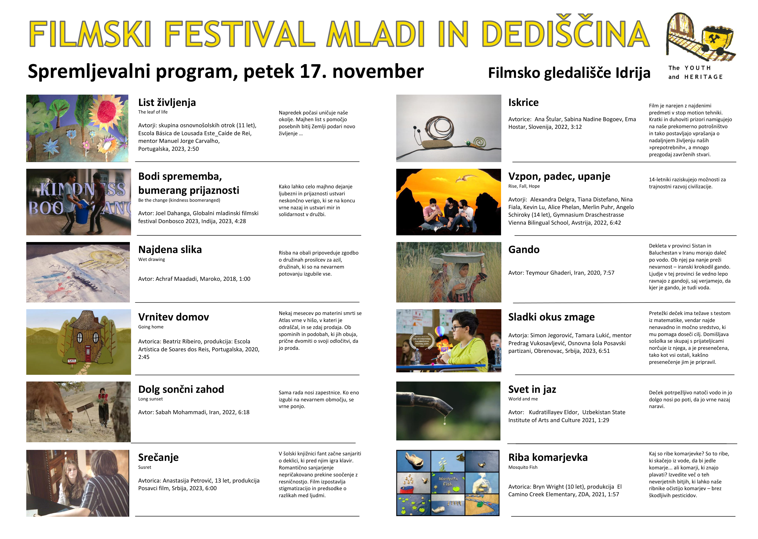 V petek, 17. novembra 2023 ob 16.00 vabljeni v Filmsko gledališče Idrija, na drugi dan filmskega festivala Mladi in dediščina 2023.