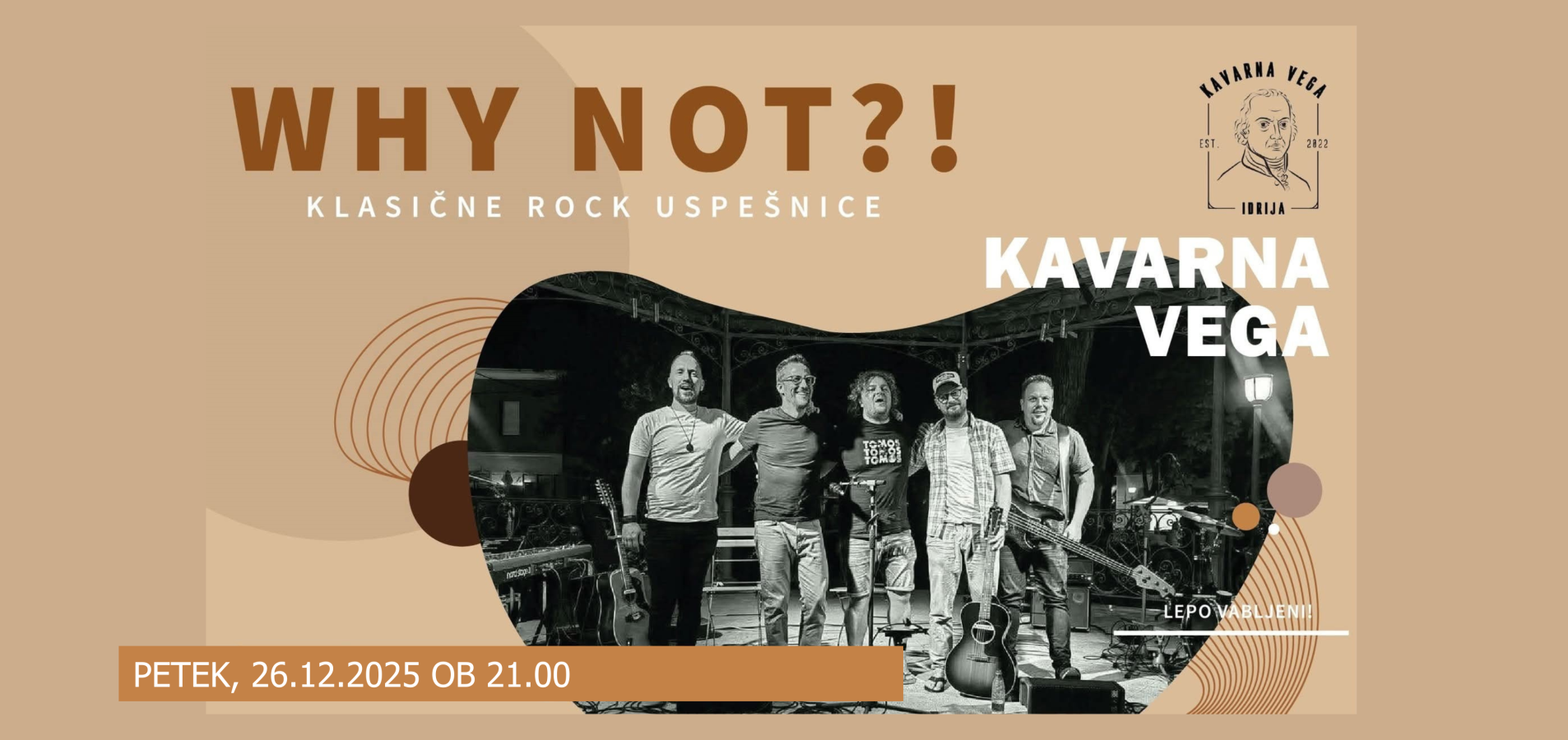 V petek, 26. decembra 2025 ob 21.00 bo v Kavarni Vega nastopila skupina Why Not, ki preigrava priredbe znanih rock izvajalcev in avtorsko glasbo.