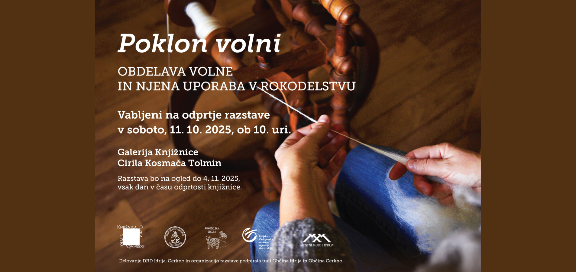 Vabljeni na odprtje razstave članic rokodelske sekcije Društva rejcev drobnice Idrija-Cerkno: POKLON VOLNI, v soboto, 11. 10. 2025, ob 10. uri v galerijo Knjižnice Cirila Kosmača v Tolminu.