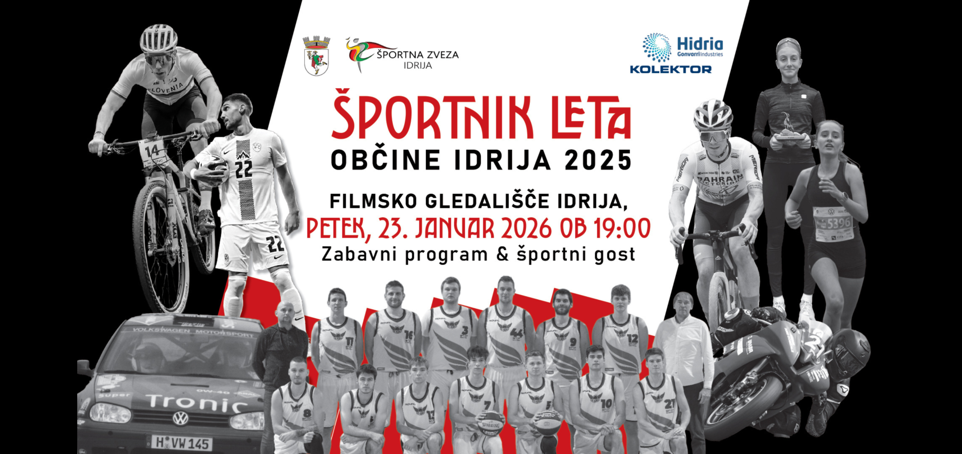 V petek, 23. januarja 2026 ob 19.00 vabljeni v Filmsko gledališče Idrija na prireditev Športnik leta občine Idrija 2025.