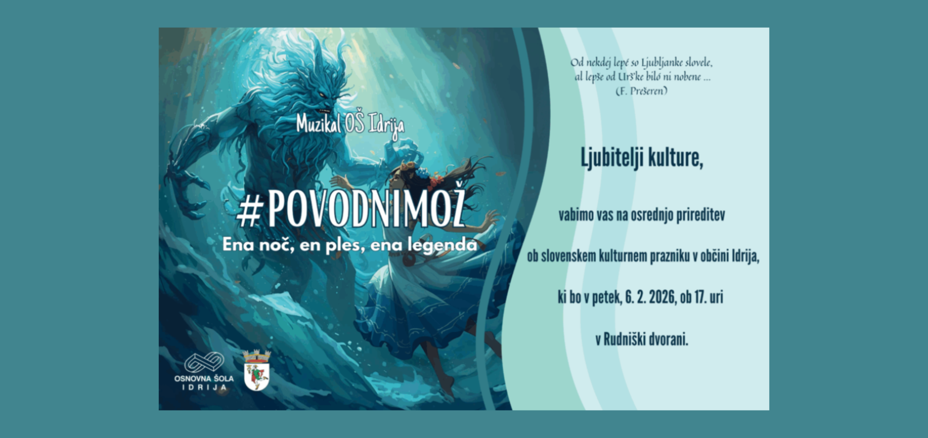Lepo vabljeni na osrednjo prireditev ob slovenskem kulturnem prazniku v občini Idrija, ki bo v petek, 6. 2. 2026, ob 17. uri v Rudniški dvorani v Idriji.